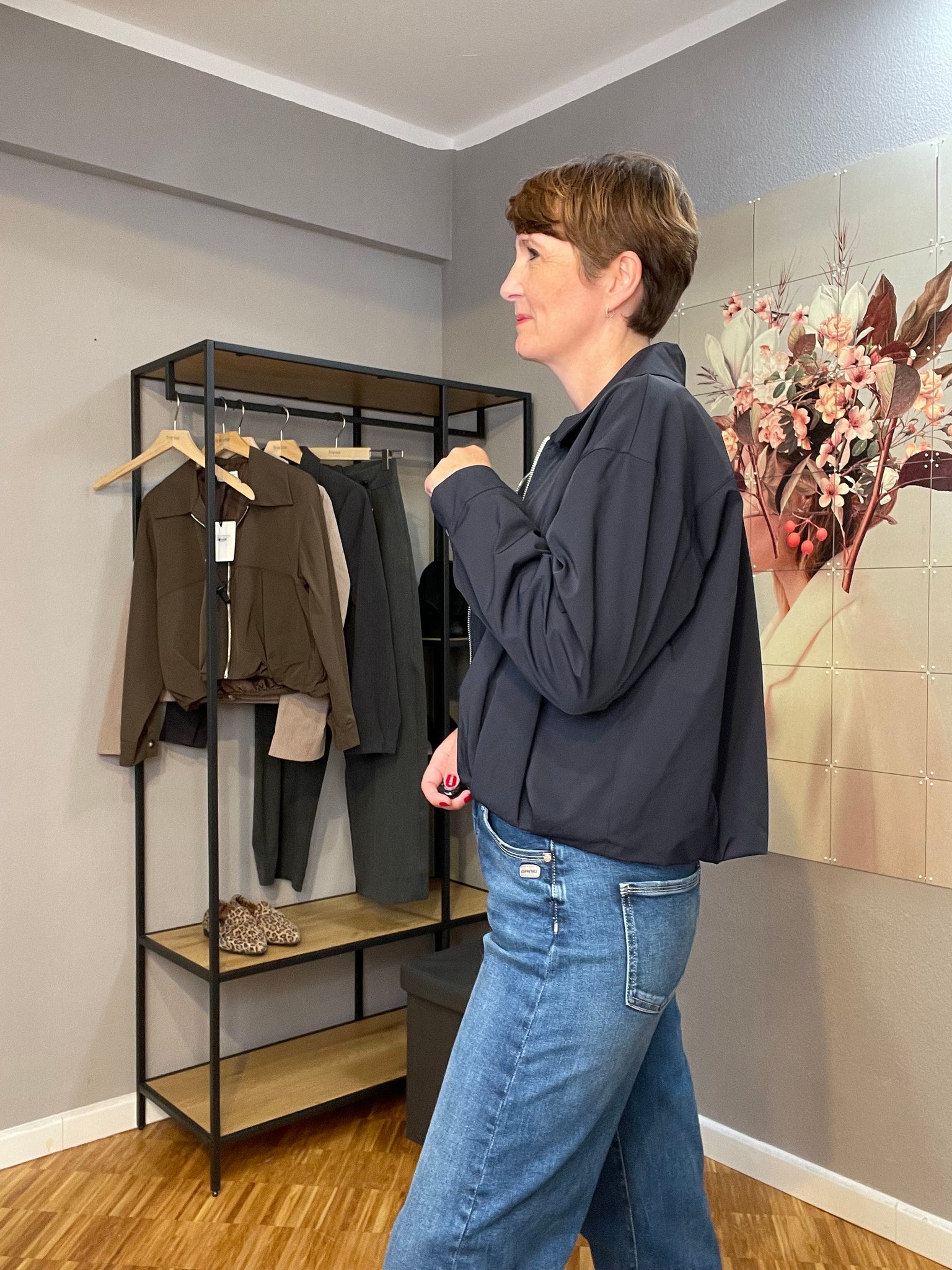 Blouson in Oversize-Passform mit klassischem Kragen und silberfarbenem Reißverschluss. Auf jeder Seite befindet sich eine kleine Tasche die die Öffnung im oberen Bereich hat. Die Raffung am Bund sorgt für eine dezente Formgebung. Das Material ist super leicht und angenehm zu tragen.