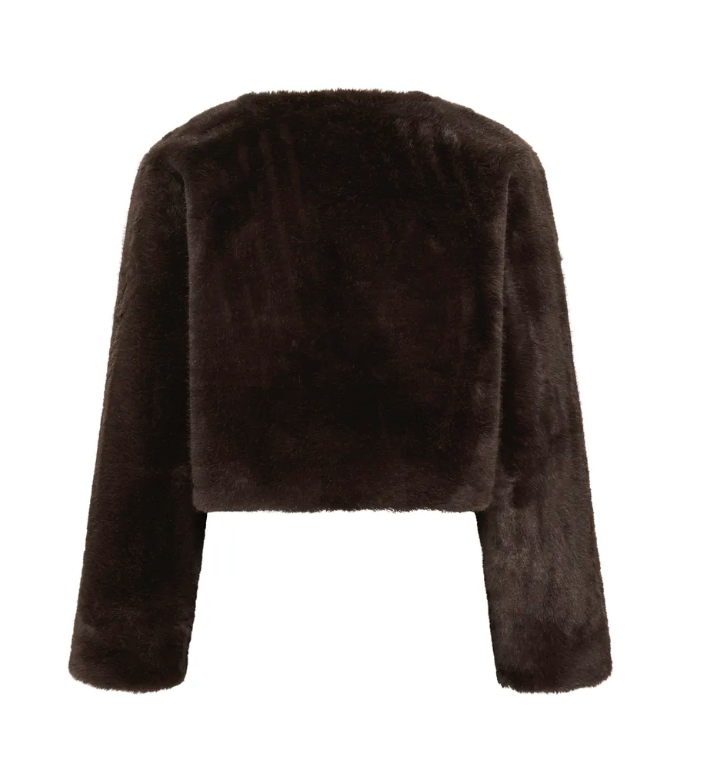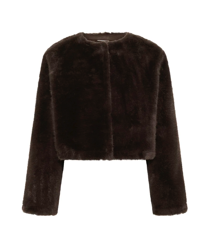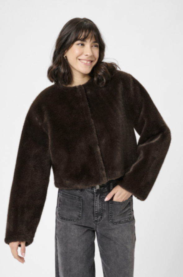 Diese Jemmy Jacke von Kaffe aus softem Kunstfell überzeugt mit ihrer kurzen, kastigen Passform und einem schlichten Rundhalsausschnitt.