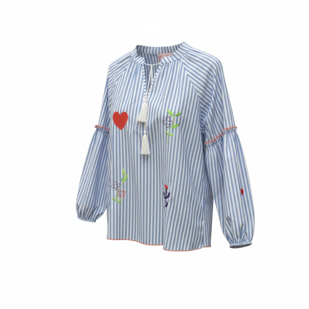 Diese Bluse von Esvivid überzeugt mit einem frischen Streifenmuster und liebevollen Stickereien, die dem Look eine moderne, verspielte Note verleihen.