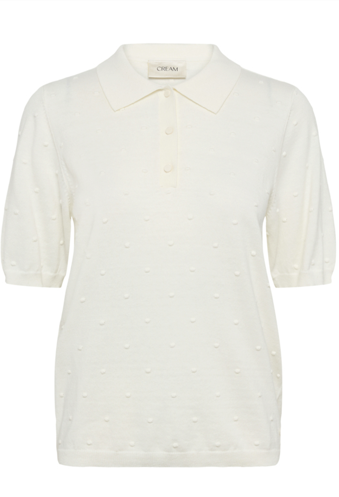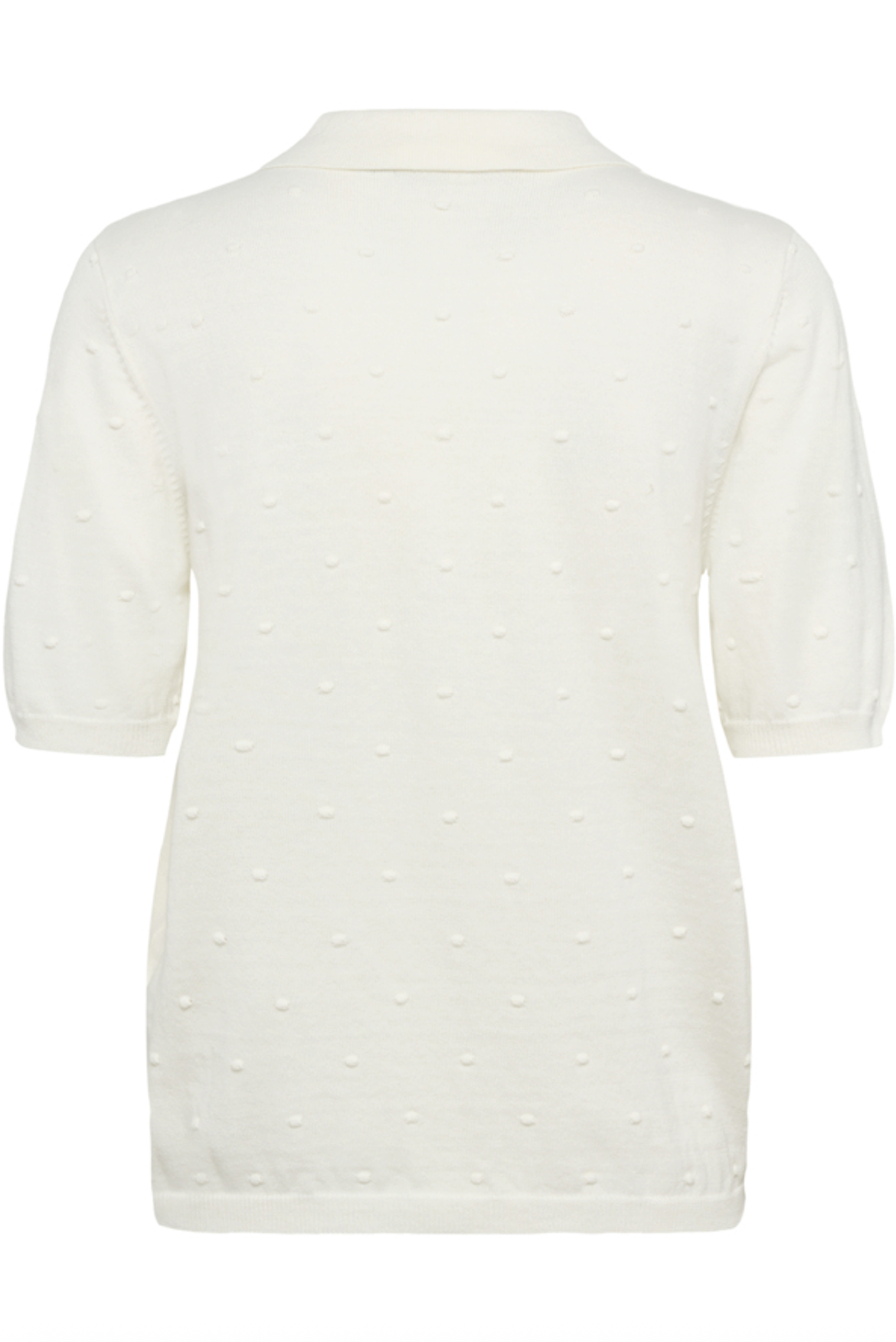 Das eingearbeitete Punktmuster verleiht dem cleanen Look eine feminine Note, während Kragen und kurze Knopfleiste den klassischen Polo-Charakter unterstreichen. Die leicht verkürzten Ärmel mit sanftem Volumen sorgen für eine moderne Silhouette.
