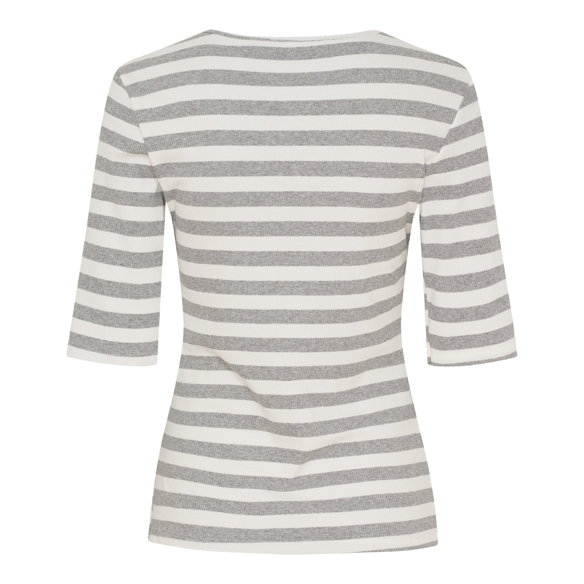 Der feine Rippjersey sorgt für eine angenehme Struktur und betont die Silhouette, während der klassische Rundhalsausschnitt und die halben Ärmel dem Design eine klare, feminine Linie geben.