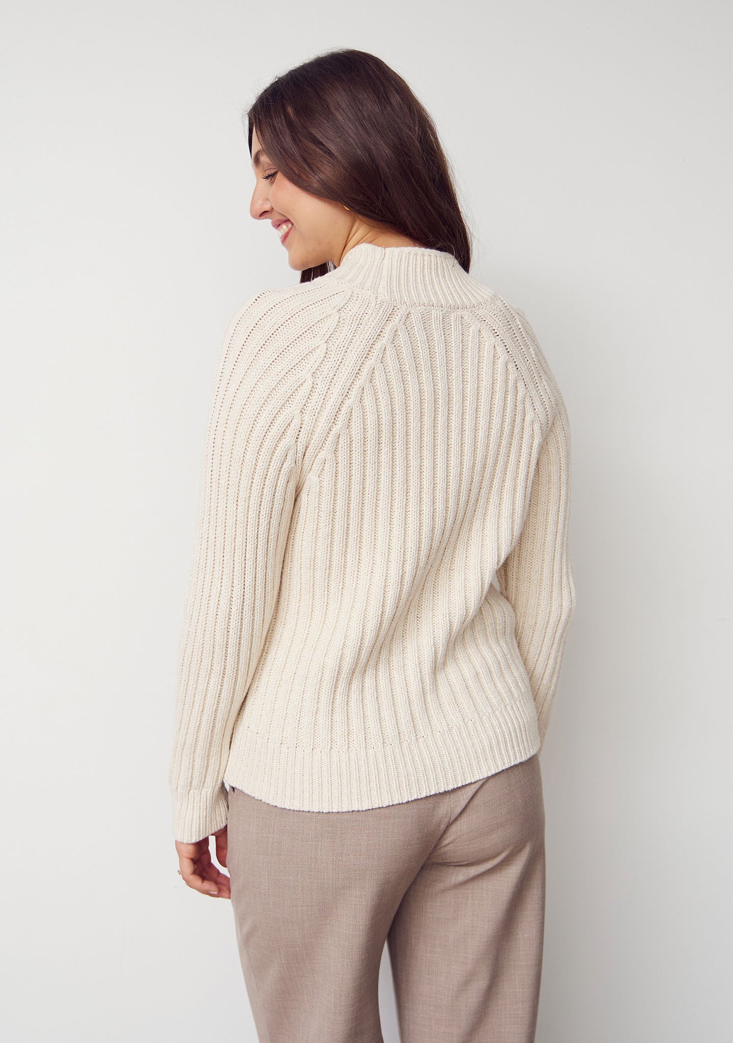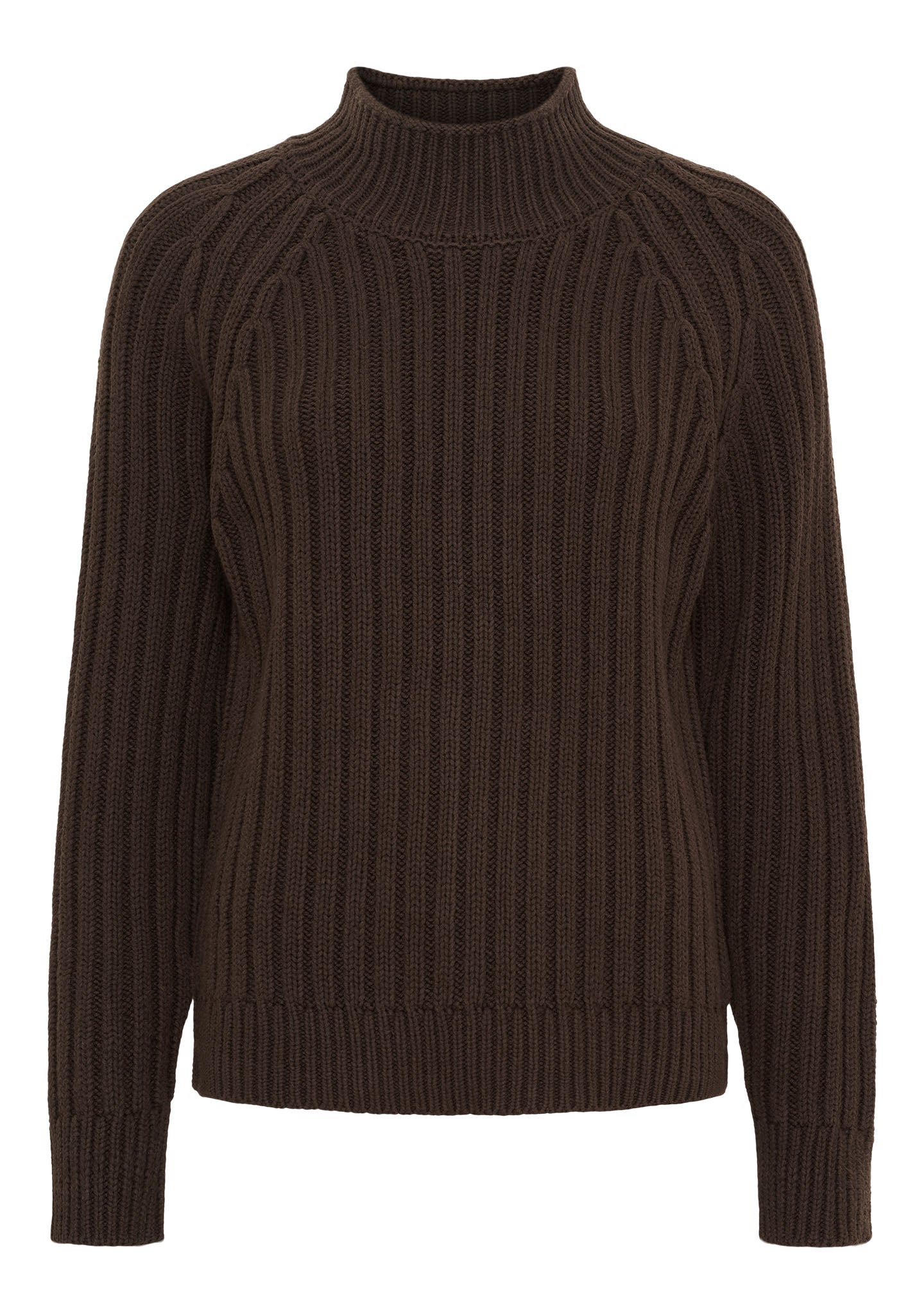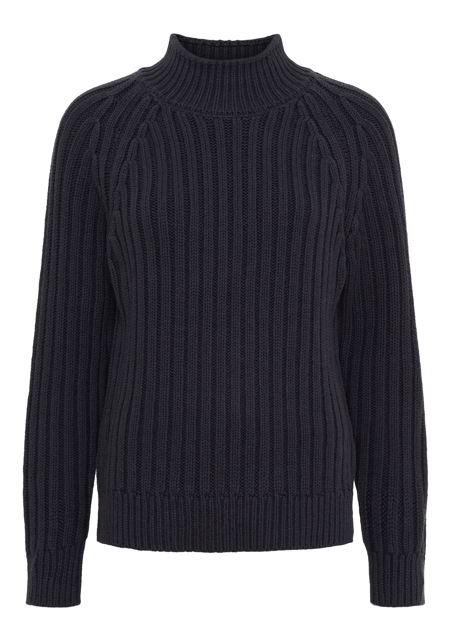 Der hohe Kragen bietet Wärme und eine elegante Note, während die Raglanärmel für eine lockere, schmeichelnde Silhouette sorgen. Die feine Rippstruktur verleiht dem Strickpullover eine moderne Tiefe und unterstreicht seinen klassischen Charakter.