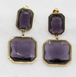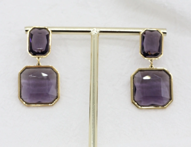 Ein Statement in Farbe und Form, die Amara-Ohrringe vereinen goldene Akzente mit tiefvioletten Glassteinen in geometrischem Schliff. Das Design erinnert an modernen Retro-Glamour und verleiht jedem Look einen Hauch von Eleganz.